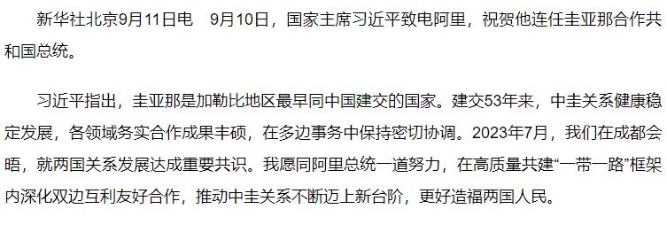 習(xí)近平向圭亞那總統(tǒng)阿里致賀電