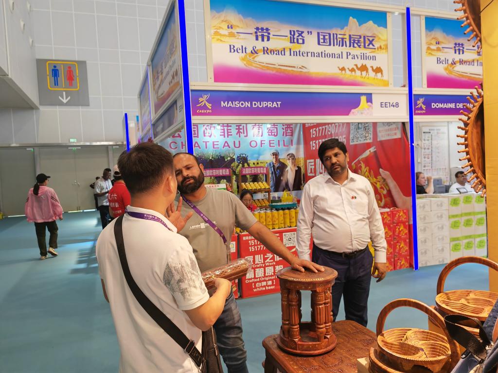 消費(fèi)者和巴基斯坦參展商商議貨品價(jià)格(9月19日攝)。新華社記者 朱麗莉 攝