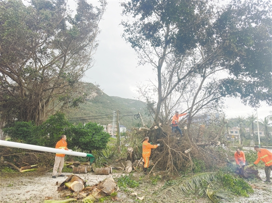 在上川島、下川島,各方搶險救援力量已陸續(xù)到位。圖為交通系統(tǒng)工作人員正在清理倒伏樹木,全力恢復(fù)交通。畢松杰 攝