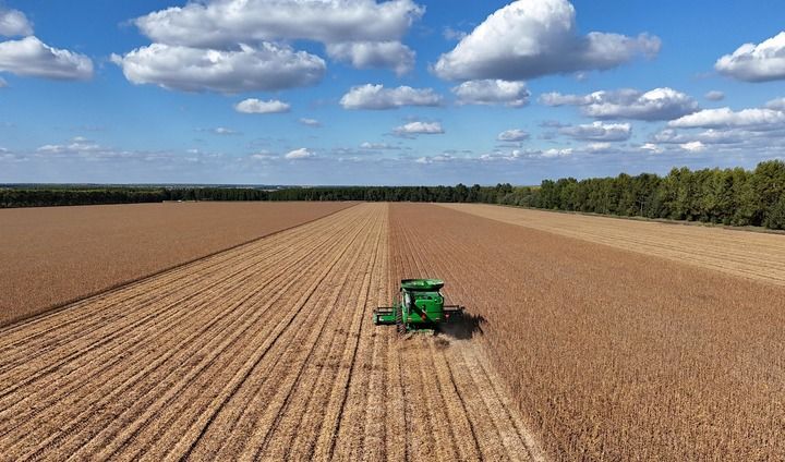 ??2025年9月19日,在北大荒集團黑龍江格球山農(nóng)場有限公司大豆地塊,收獲機車在進行收獲作業(yè)(無人機照片)。新華社發(fā)(陸文祥攝)