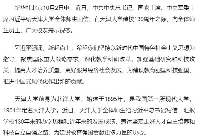 習(xí)近平給天津大學(xué)全體師生回信強(qiáng)調(diào) 聚焦國家重大戰(zhàn)略需求提高人才培養(yǎng)質(zhì)量 更好服務(wù)經(jīng)濟(jì)社會(huì)發(fā)展