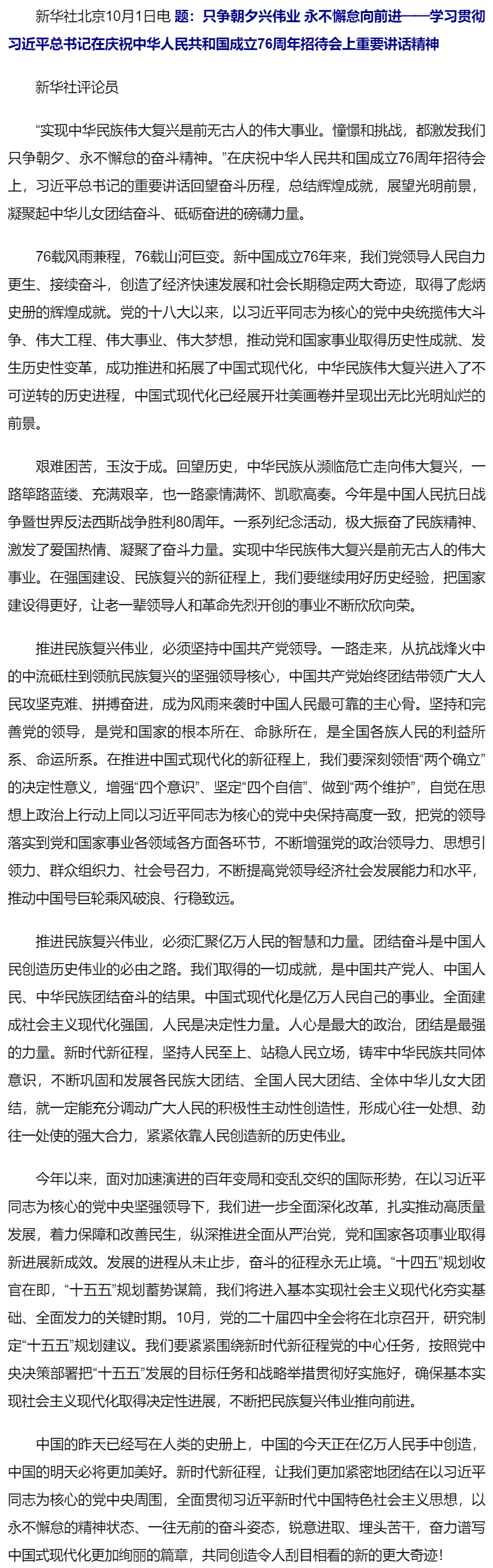 新華社評論員:只爭朝夕興偉業(yè) 永不懈怠向前進——學習貫徹習近平總書記在慶祝中華人民共和國成立76周年招待會上重要講話精神
