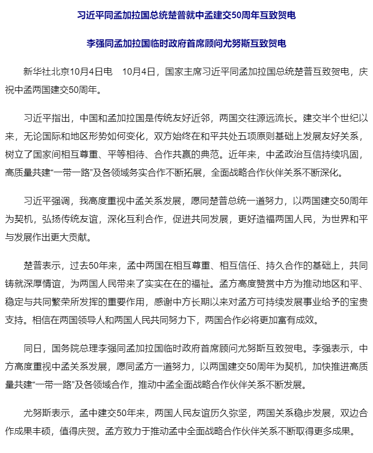 習(xí)近平同孟加拉國(guó)總統(tǒng)楚普就中孟建交50周年互致賀電