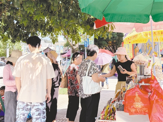 ????“帥哥美女,嘗嘗我們的陳皮花生?!薄瓣惼ぞG豆沙清熱消暑,來(lái)一碗吧!”“你們這朵陳皮玫瑰花怎么做的?好別致?!毖刂杩哟尻惼ど虡I(yè)街閑逛,村道古色古香的韻味與現(xiàn)代商業(yè)氣息融合得恰到好處。這里匯聚了多家店鋪,涵蓋柑普茶、小青柑、葵扇等本地特色產(chǎn)品,商販與顧客之間的互動(dòng)有來(lái)有回,在談笑間便促成了一單又一單小買(mǎi)賣。