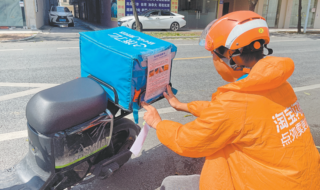 ????鶴山動員快遞員、外賣騎手、網(wǎng)約車司機等新就業(yè)群體參與疫情防控,組建了由順豐、EMS、美團、餓了么等企業(yè)騎手和快遞員組成的網(wǎng)約配送行業(yè)志愿服務(wù)隊。騎手利用等待出餐的3至5分鐘,提醒商戶清理后廚排水溝等風(fēng)險區(qū)域,動員沿街商戶加入聯(lián)防聯(lián)控網(wǎng)絡(luò)。