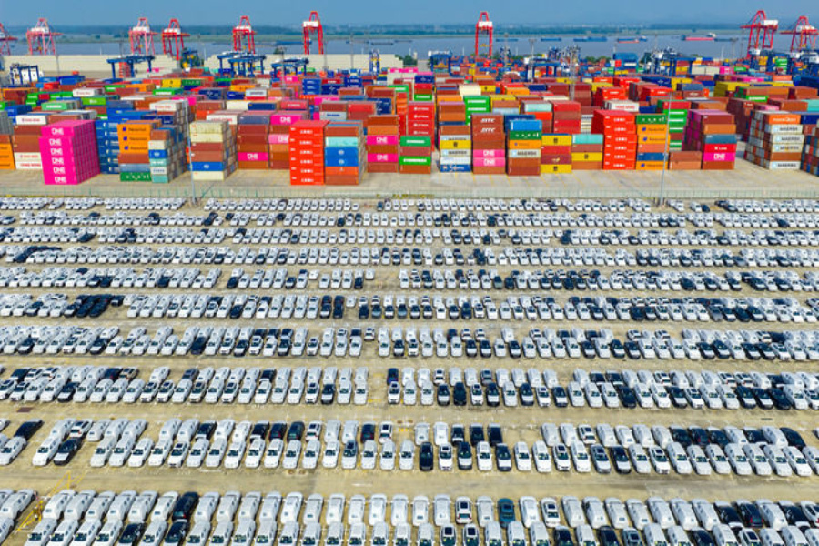??2025年10月4日在江蘇省港口集團南京港龍?zhí)陡蹍^(qū)拍攝的準(zhǔn)備裝船出口的汽車(無人機照片)。新華社發(fā)(楊素平攝)