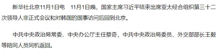 習(xí)近平結(jié)束出席亞太經(jīng)合組織第三十二次領(lǐng)導(dǎo)人非正式會(huì)議和對(duì)韓國(guó)的國(guó)事訪問(wèn)回到北京