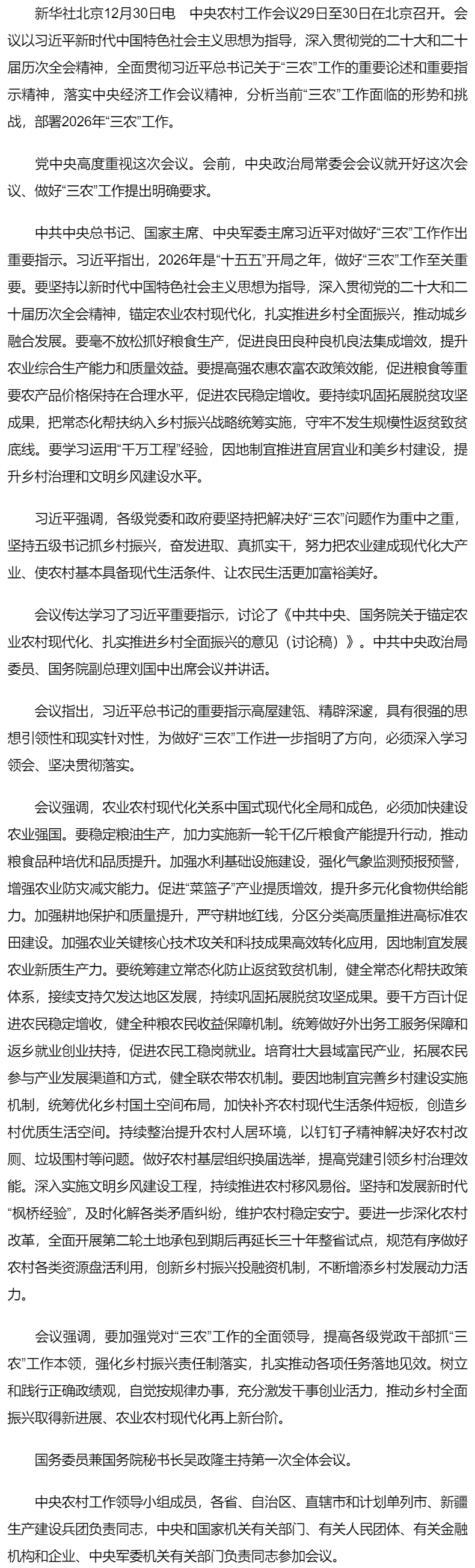 中央農(nóng)村工作會(huì)議在京召開 習(xí)近平對(duì)做好“三農(nóng)”工作作出重要指示