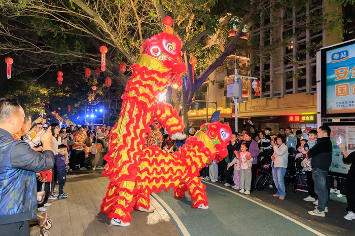 在“奇思妙享趣江?!痹┗顒?dòng)中,江南路夜光醒獅巡游亮相,眾多市民游客駐足觀賞。