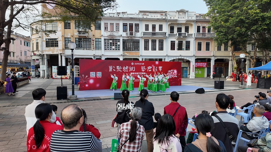 ????“祝大家新年快樂!”在青年廣場(chǎng)上,“歡聚墟街樂啟新年”文藝演出準(zhǔn)時(shí)上演,街頭音樂婉轉(zhuǎn)悠揚(yáng),舞蹈表演活力四射,粵劇選段韻味悠長(zhǎng),武術(shù)展示剛勁有力,非遺與現(xiàn)代藝術(shù)的融合贏得陣陣掌聲。